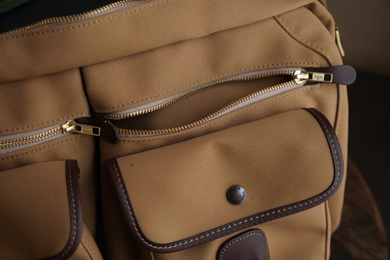 計6つのポケットと内部の仕切りにより、荷物をすっきりと収納可能。素材にはボンディング加工を施したキャンバスを使用し、防水性と軽さを両立しています。随所に配されたブライドルレザーや、雨の侵入を防ぐ構造など、ブランドらしい機能性も魅力です。